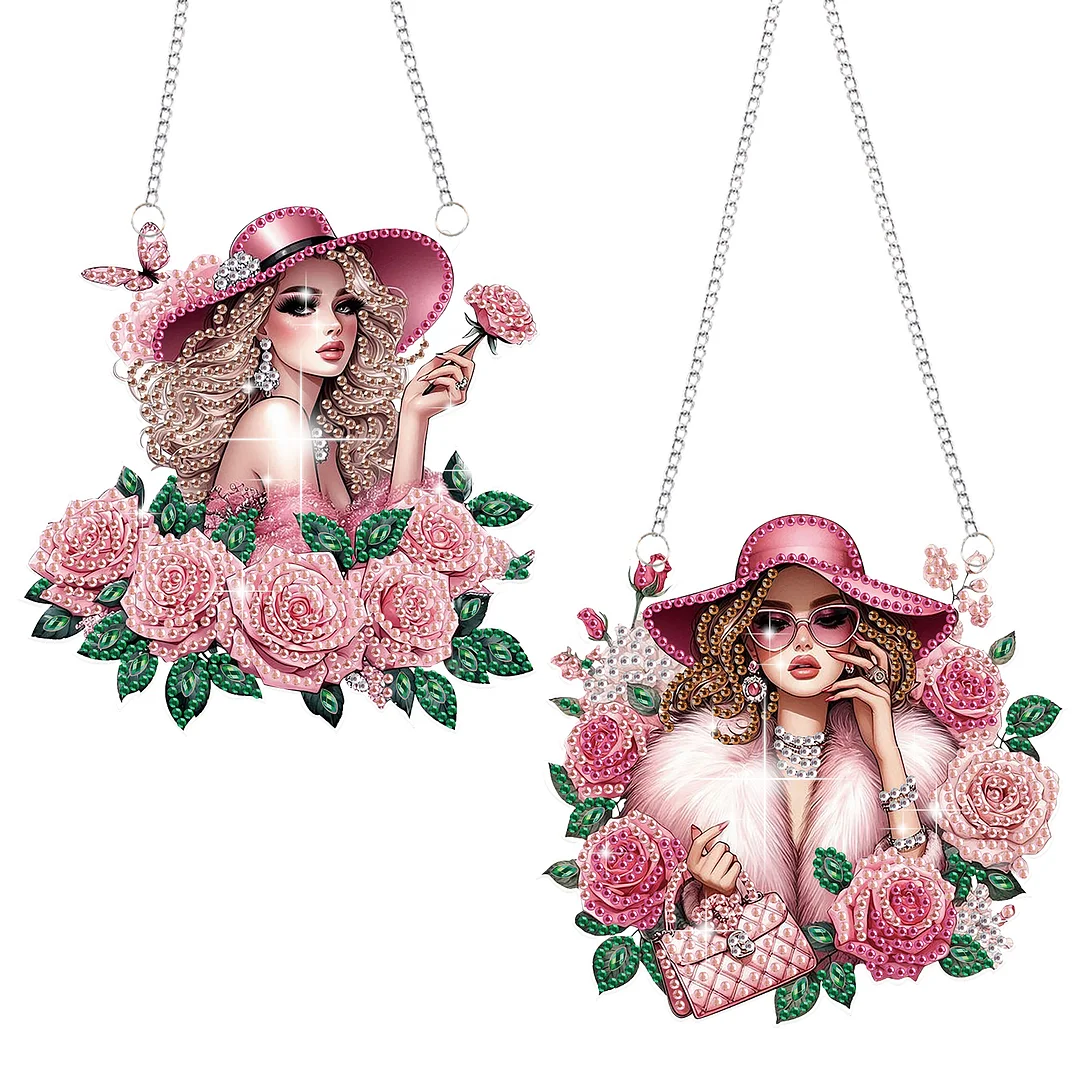 2Pcs Girl 2D Flat DIY Hanging Diamond Art Ornament Window Pendant (Floral Hat)